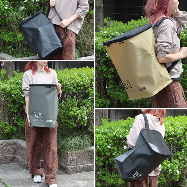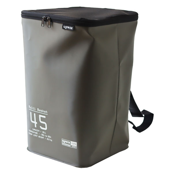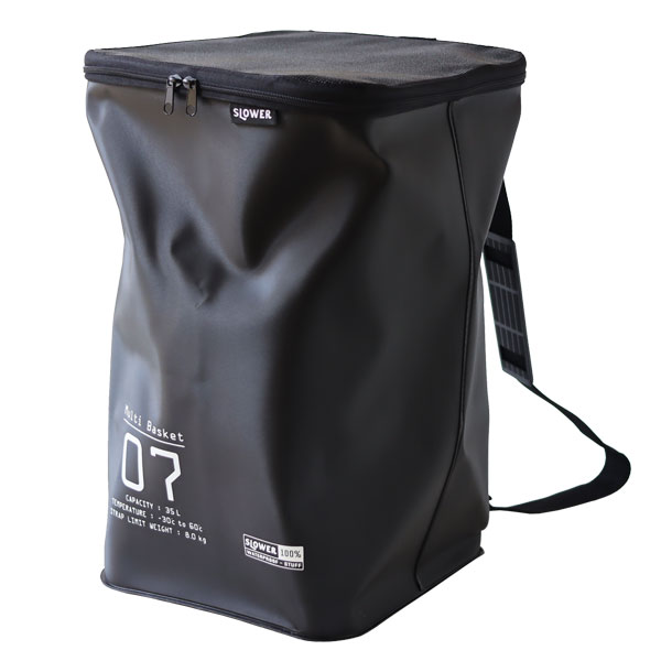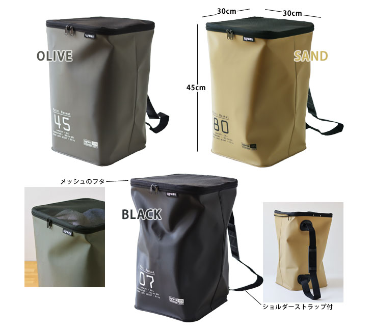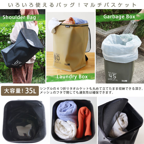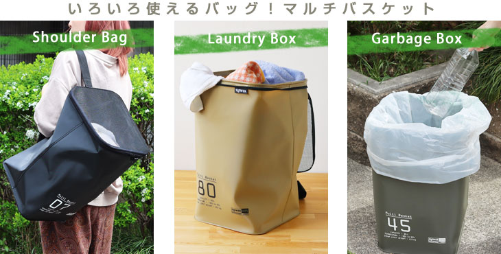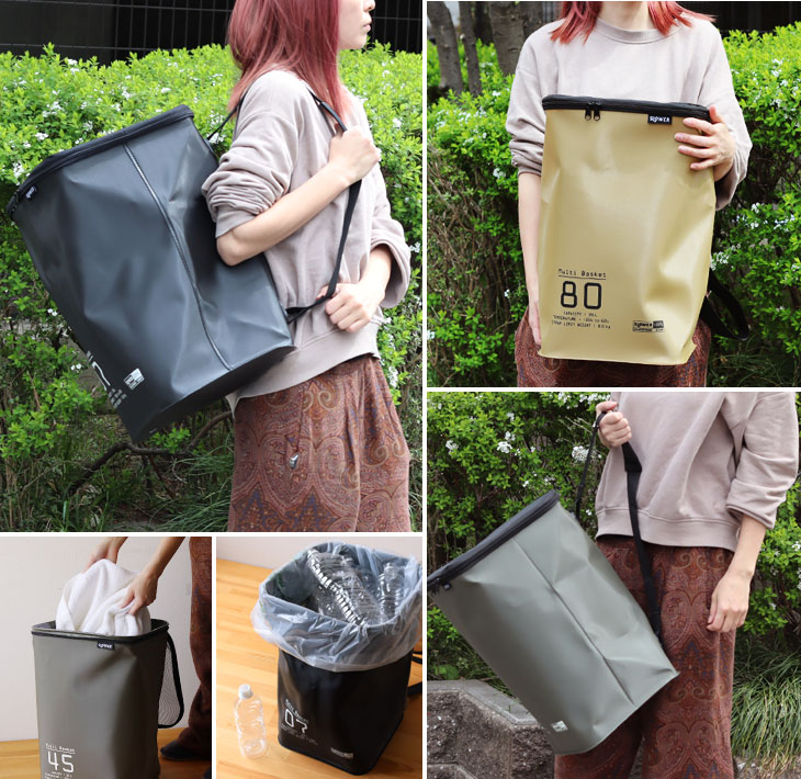 くいろいろなシーンで活躍してくれる「マルチバスケット」です。 ◎Shoulder Bag:タフなバッグとして部活やスポーツ用に! 35リットルの大容量は道具類もまとめて運ぶのに便利です。 濡れたものを入れてもバッグの底から水が漏れることはありません。 汗や泥で汚れても水洗いしてさっとふけばすぐに使うことができますね。 ◎Laundry Box:洗濯物入れに! 汗だくの衣類も泥が付いたソックスも気にせず入れられます。 ショルダーのストラップを引っかけて洗面にセットすれば床の場所をとらないランドリーボックスに。 いっぱいになったらフタを閉じてコインランドリーへ直行です! ◎Garbage Box:簡易ゴミ箱に! 本体は強度のあるEVA樹脂でハリがあるのでバスケットの形をキープしてくれます。 45リットルのゴミ袋をセットしてゴミ箱や家庭ごみの分別用コンテナに。 レジャーでは蓋をファスナーで閉じればゴミを落とすことなく持ち運べます。 ショルダーのストラップがあるので肩にかければ手が使えるので他の荷物も運べて助かります。