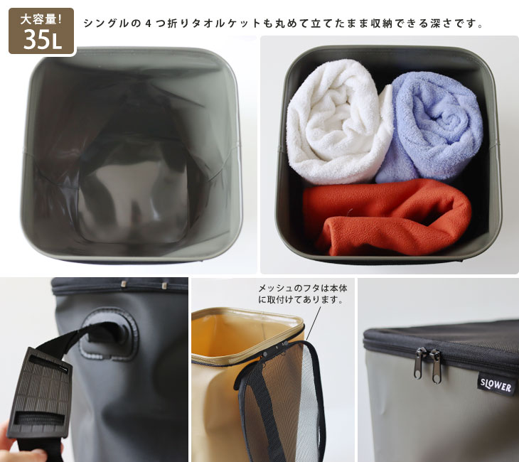 縦型の大容量35リットル入るバスケットなら洗濯物もたっぷり入れることができます。 シングルのタオルケットなら4つ折りして巻いた状態でも立てて収納することができます。 本体上部のフタはファスナーで簡単に開け閉めでき全開にすることができます。 一部は本体に取り付けてあるのでフタを紛失してしまうことはありません。 ショルダーのストラップは持ち手にもなり、洗濯物を出し入れもしやすく便利です。