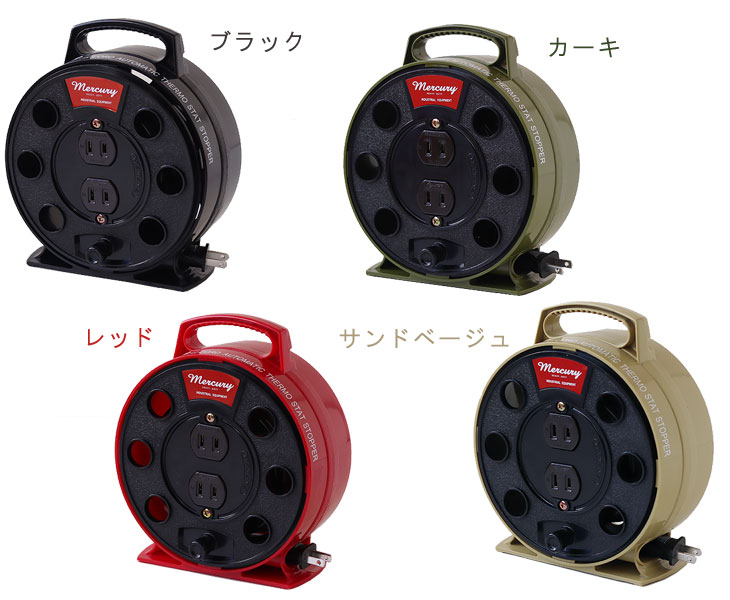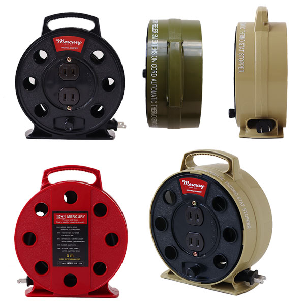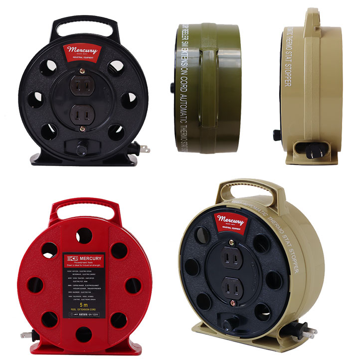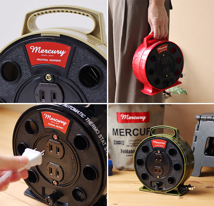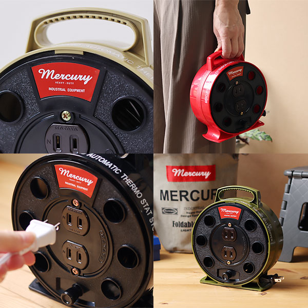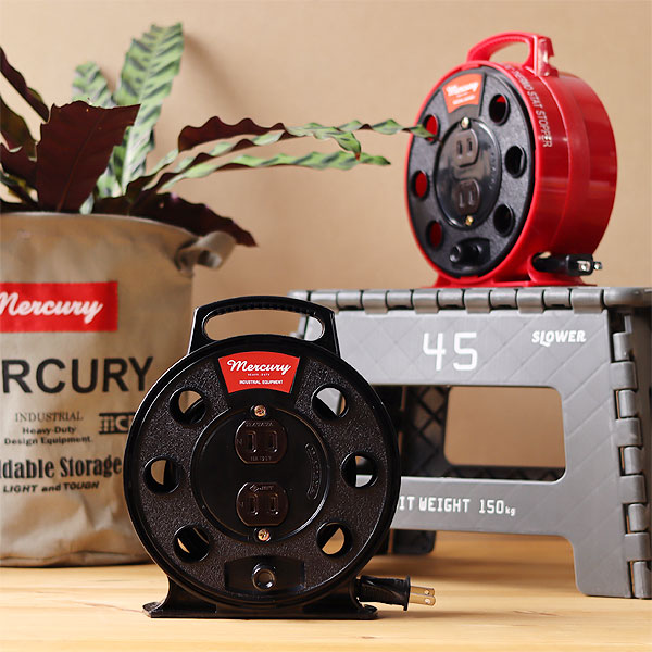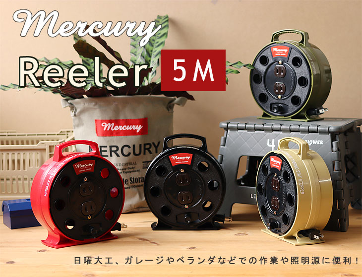 コンセントから離れた場所で電気を使う際に使用する延長コードをドラムで巻き取ることでより簡単に使用、管理できるようにしたもの。 コンセントが近くにないシチュエーションでも、リーラーならコードの長さが5mもあるので、 お部屋から玄関まで、ベランダまで、お庭まで、と電源を長い距離延長して使用することが可能です。 日曜大工、ガレージやベランダでの電動工具を使う作業や照明源に最適な屋内タイプ。 コンセントは2つ、コード部分は5m、お部屋に1台あるととっても便利です! MERCURY STORY 1996年、MERCURYブランドは1台の電話機から始まりました。 アメリカのモーテルやガレージライフのデザインからインスピレーションを受けたプロダクトは、リストウォッチ・扇風機やシャンデリアなど多岐にわたりその独特な色合いと相まって好評を博しました。 1999年に発売されたガルバナイズバケツと、翌2000年に発売されたメールボックスはともに驚異的なヒット作となり、それ以来20年以上販売され続けています。 MERCURYと聞くと、ブリキのバケツやスチールのメールボックスを思い浮かべる人が多いかもしれません。 MERCURYは、アメリカテイストのデザインと高品質で所有する人を豊かで便利にするとともに、所有する喜びを味わえる製品の開発をしています。