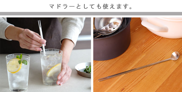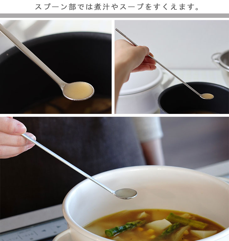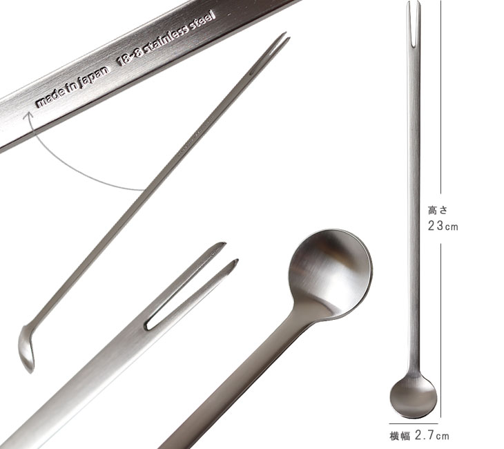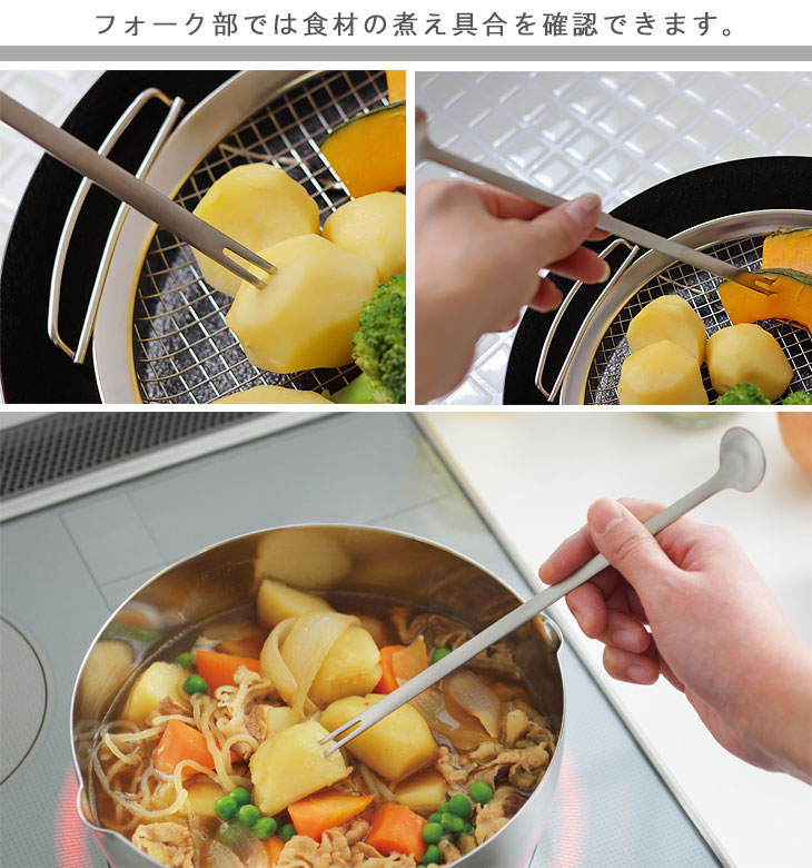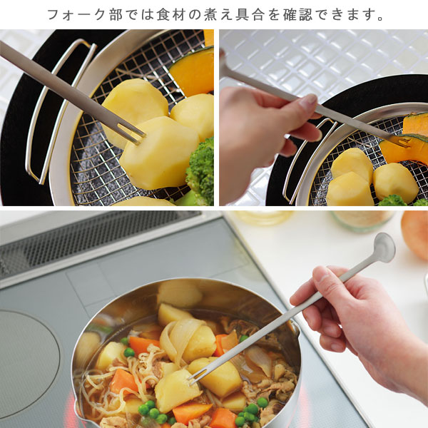 | 味見用のスプーンと食材の煮え具合を確認するフォークが一体に |
