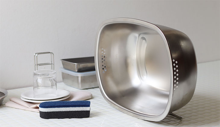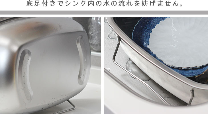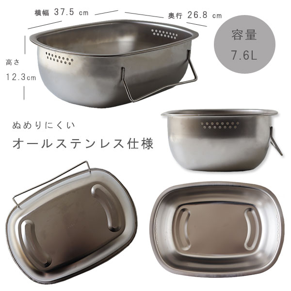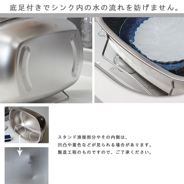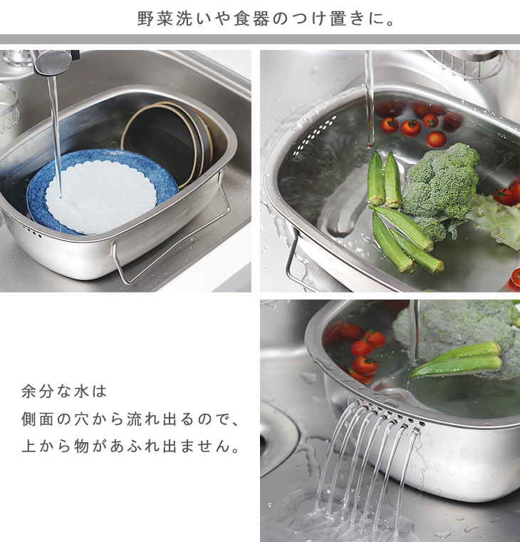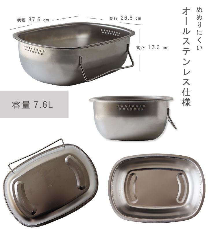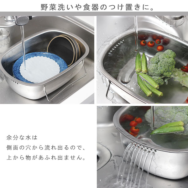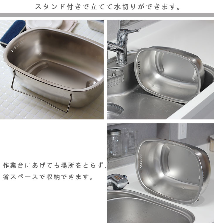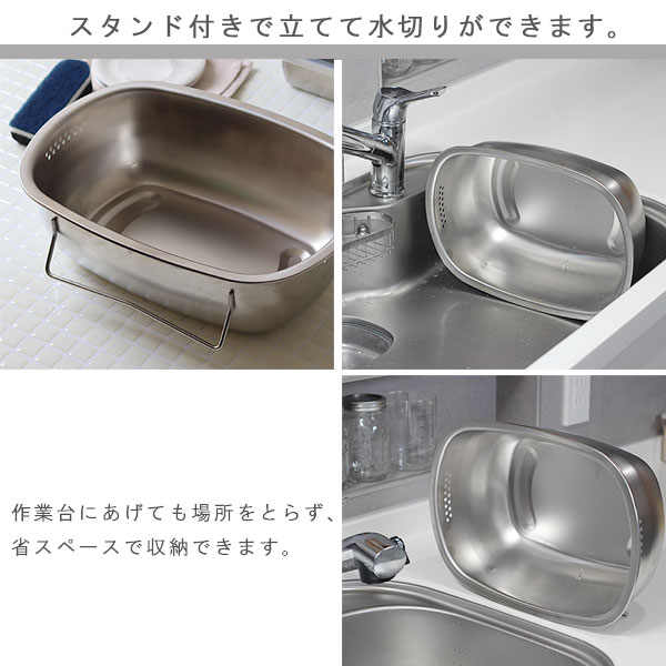 | 立てて水切りできる衛生的なオールステンレス洗い桶 |