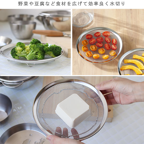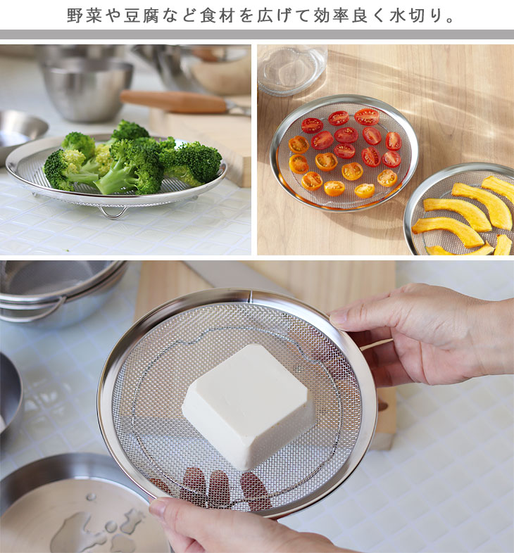 | 食材を広げて効率良く水切り。豆腐の水切りや油抜きにも便利 |