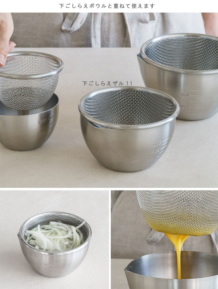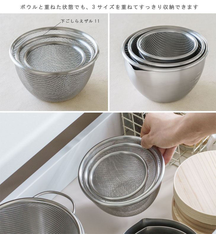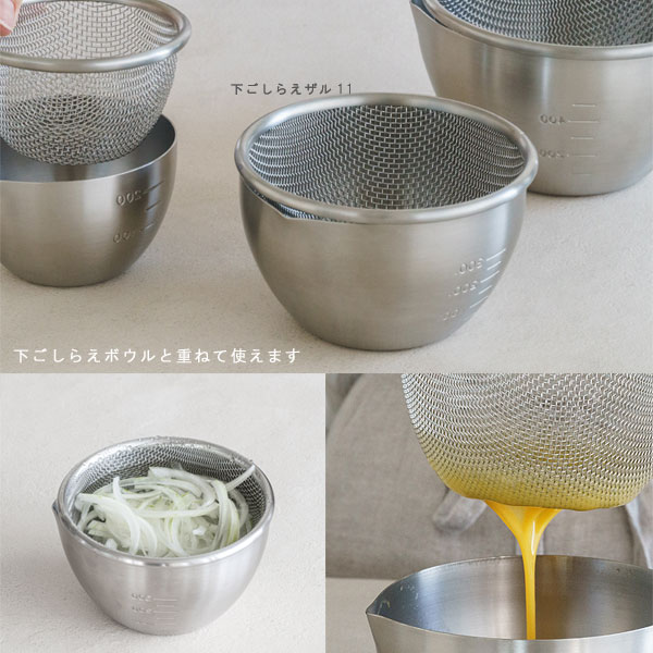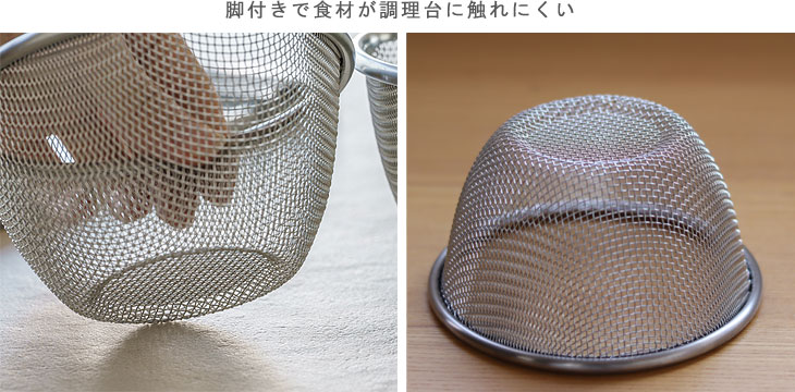 | 食材の水さらしや卵液濾しといった下ごしらえに便利なザル |