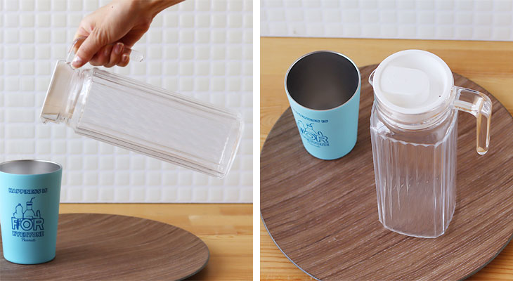 透明だから中身も一目瞭然なのが嬉しいですね! コーヒーや紅茶、お気に入りのハーブーティーなんかもピッチャーに保存すれば、飲みたいときにすぐ飲めちゃいます。 しかもそのままテーブルに置いて使ってもオシャレ。おうちでカフェ気分が味わえちゃいます♪ ※冷蔵庫専用。耐熱ガラスではありません。 |