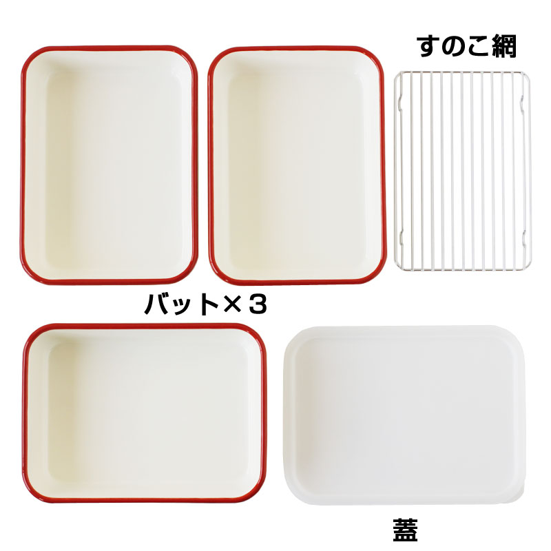 バット3点、フタ、すのこ網の5点セットですぐに調理に使えます。 蓋を使えばそのまま冷蔵庫の入れ保存することができます。 また、蓋を外せばそのまま火にかけることができます。 こんなシンプルでオシャレなバットのセットがあれば、いつものキッチンもなんだかステキ。 お料理するのが楽しくなりそうですよ♪ 琺瑯は鉄にガラス質を施し高温で焼き上げた素材。なので表面がガラス質になり、食品の化学変化を防ぐことが出来るのです。 また、料理の味を変えることがなく素材のよさを生かして調理できます。保存性にもとても優れているんですよ♪