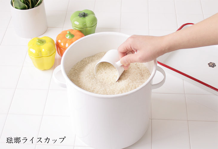 すりきれ一杯で一合(180cc)のライスカップ。米びつに入れておくと便利ですよ。 プラスチック素材だと、カップに付いた傷にばい菌が入りやすく臭いもつきやすいですよね。 琺瑯なら衛生的で臭いもつきにくく、安心です。 毎日のことだから長く使えて愛着の持てるモノを選びたいですね。 キッチン用品を琺瑯で揃えて使ってもオシャレ♪