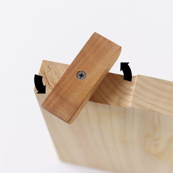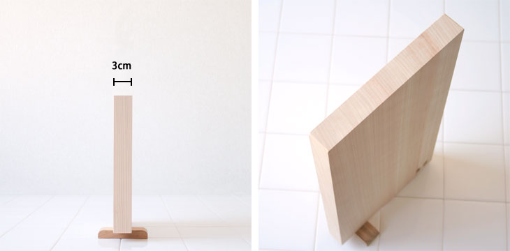 食材を切るときもずれにくいデザインになっています。 まな板の横部分には、まな板と同じひのきでできたスタンドがついています。 スタンドを横にずらせば、まな板を立てて収納することができるのでとっても便利。 スペースの少ないキッチンでも、場所を取らないからうれしいですね。 立てておくことで、まな板の水切りも素早くできますよ。