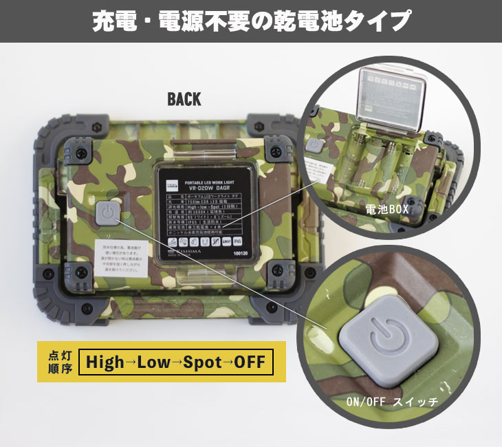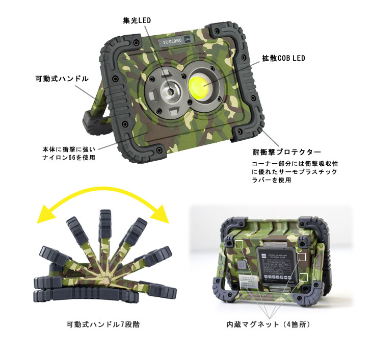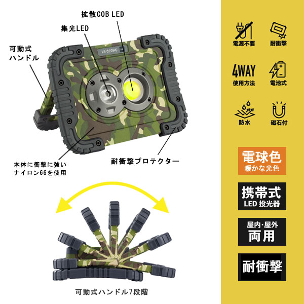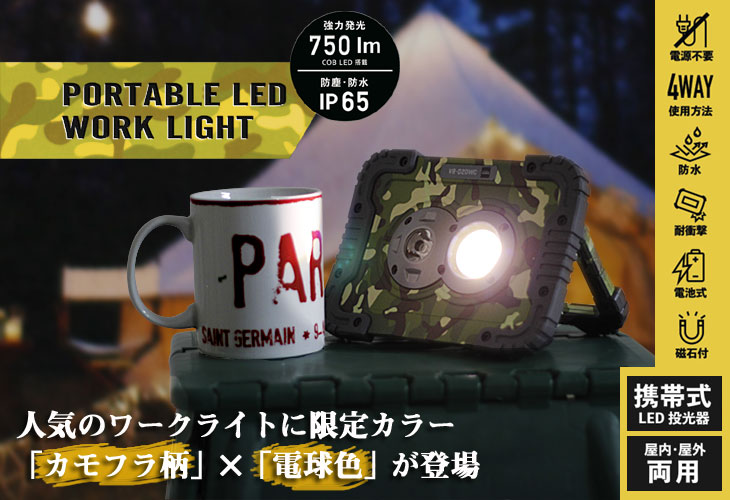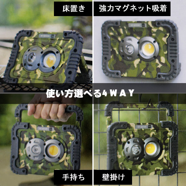 キャンパーの熱い支持を受けて人気のワークライトに限定カラー「カモフラ柄」x「電球色」が登場! 広範囲をムラなく均一に照らす高輝度、電球色COB LEDを搭載し、眩しいほどの明るさを実現したワークライト! 充電・電源不要の乾電池タイプのため、停電時や屋外でも安心。 床置き・手提げ・マグネット吸着・壁掛けの4通りのご使用方法が選べます。 広範囲を照らすCOBタイプLEDと、ピンポイントの集光タイプLEDW搭載で、シーンに合わせて使い分けできます。 本体に衝撃に強いナイロン66、コーナー部分には衝撃吸収性に優れたサーモプラスチックラバーを使用し、本体を衝撃から守ります。 軽量・薄型でアウトドアにも持ち運びらくらく! IP65の防雨・防塵設計のため、屋外作業やレジャーなど幅広くご使用いただけます。