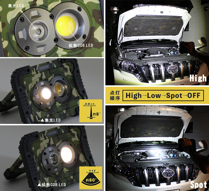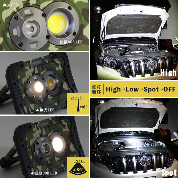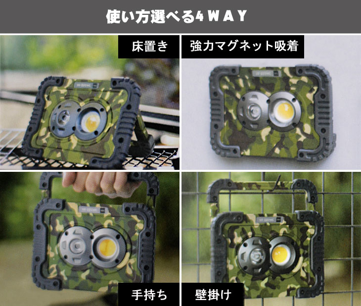 | アウトドアや整備に!ワイド/スポット切替え使い方4WAY作業灯 |
