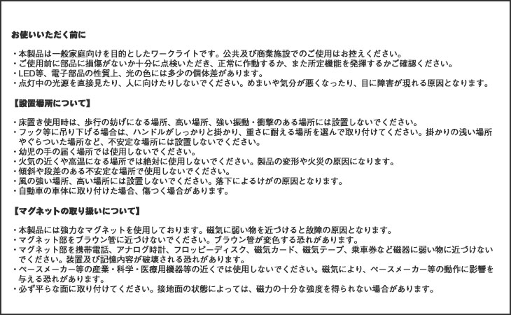 電源・充電不要 停電時や屋外でも安心の乾電池タイプ。 市販の高容量ニッケル水素充電池への交換も可能です。 ※電池は付属しておりません。 充電が途中で切れるストレスと無縁な交換容易な電池式! 携帯バッテリーの発火で問題となったリチウムイオンバッテリーを使用しない安全な電池式です。 電池の取り付け方法 1.電源を切り、電池蓋を開いて電池ボックスの図の向きに合わせて電池をセットしてください。 2.電池が正しくセットされているか確認し、電池蓋を閉じます。 ※防水対応商品のため、電池蓋が硬い場合があります。ご了承ください。 スイッチ操作方法 本体裏面のON/OFFスイッチを押すたびにHIGHモード・LOWモード・スポットモード・OFFを繰り返し、2段階明るさと照射モードを調節できます。 ※本製品は強い光を発します。スイッチを押すときは、必ずLED面を横か下に向け、光源を直視しないようご注意ください。 ハンドルを可動させることで、置く・持つ・掛けるのスタンド、ハンドルとして活躍します。 裏面には強力マグネットが内蔵されているので金属の壁や天井に下げてハンズフリーで作業可能です。 ハンドルは裏面にスッキリ折りたためるので、収納時や作業時に邪魔になることもありません。 強力マグネット 本体裏側には強力ネオジム磁石を搭載。 鉄製のラックや壁面などに吸着します。 ※必ず平らな面に取り付けてください。設置面の状態によっては、磁力の十分な強度を得られない場合があります。 ・シャッターや磁力が働かない金属、薄い鉄板等では正常に取り付けられない場合があります。 ・必ず正常に磁力が働いていること、容易に落下しないことを事前に確認してください。 ※自動車の車体に取り付けた場合、傷つく場合がありますのでご注意ください。 可動式ハンドル ハンドルは7段階に可動し、床置きから壁掛けまで様々な使用シーンに対応します。 180度自在に動くハンドルで置き掛け、角度調節思いのまま。 ハンドルは180度7段階に調節可能です。 お好みの照射角度に調節してお使いください。 ※可動範囲以上に無理な力で動かさないでください。