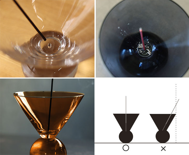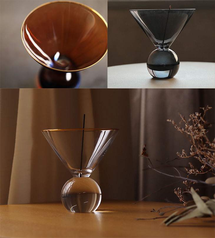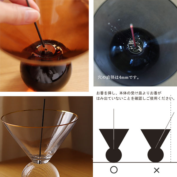 グラスのフォルムがまるでオブジェのように美しいお香立て。 受け口が広く灰がこぼれないのでテーブルも汚しません。 燃え尽きるまでの儚さを、優雅な時間に…おしゃれでクラシカルな雰囲気を纏わせて、そこにあるだけで様になります。