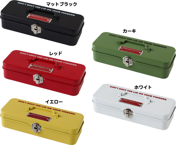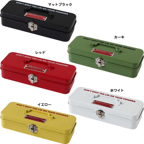 マットブラックのみ、ツヤのないシックな質感になっています。 蓋部分の文字はホワイトとイエローが赤色の文字、レッドとマットブラックが白色の文字、 カーキが黒色の文字になっています。 工具箱をそのまま小さくしたようなデザインで、蓋部分のマーキュリーの赤いロゴがアクセントになっています。
