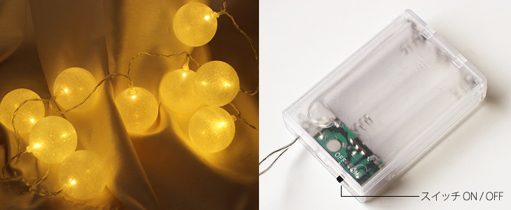 点灯時 ![]() 点灯には、単3電池×3本を使用します。 ※電池は付属しておりません。 ON(常時点灯)−中心(点滅点灯)−OFF 常時点灯だけでなく、点滅も選ぶことが可能。 シチュエーションに合わせて変化をつけてみましょう♪